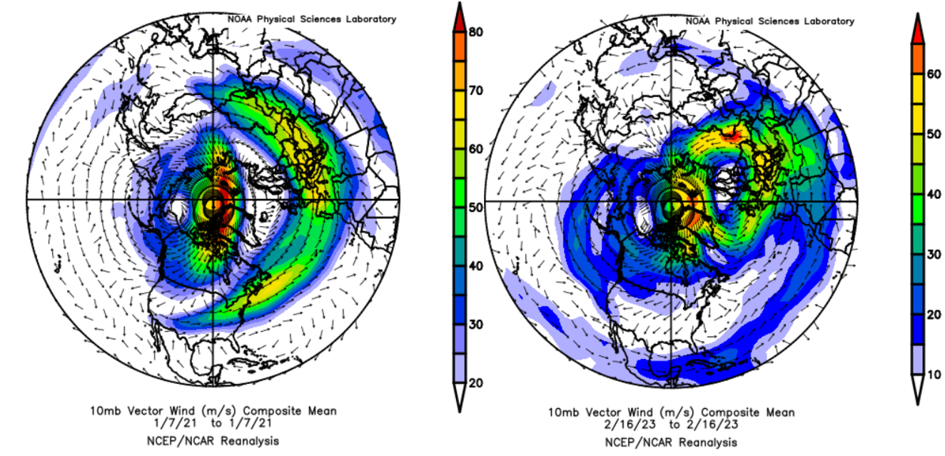 Notice how the polar vortex is displaced toward Europe in both cases but has differing structure. There’s often some ‘stretching’ of the polar vortex during these events, but it was far more pronounced in 2021’s. Both events led to cold weather outbreaks in the US, but the 2023 event much more so.