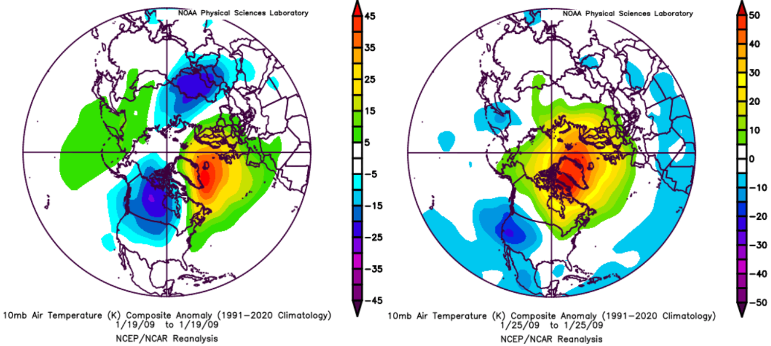 You won’t be surprised to read that this type of event involves the polar vortex being split into two (or, rarely, more) child vortexes. Two examples are shown below, with the left-hand one (January 2009) among the most impressive on record.