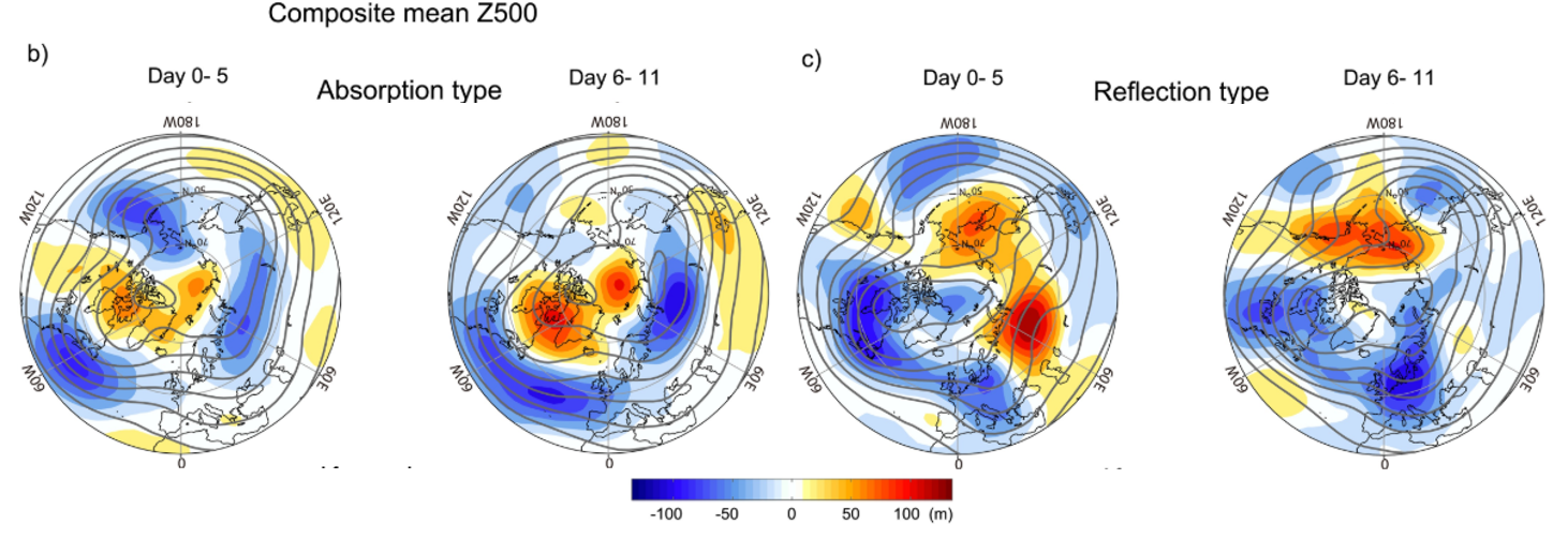 At one extreme, there are events where almost all energy is absorbed. This tends to keep the polar vortex in a highly disrupted state for at least a month. It leads to the highest probability of cold weather affecting mid-latitude regions such as North America and Europe.