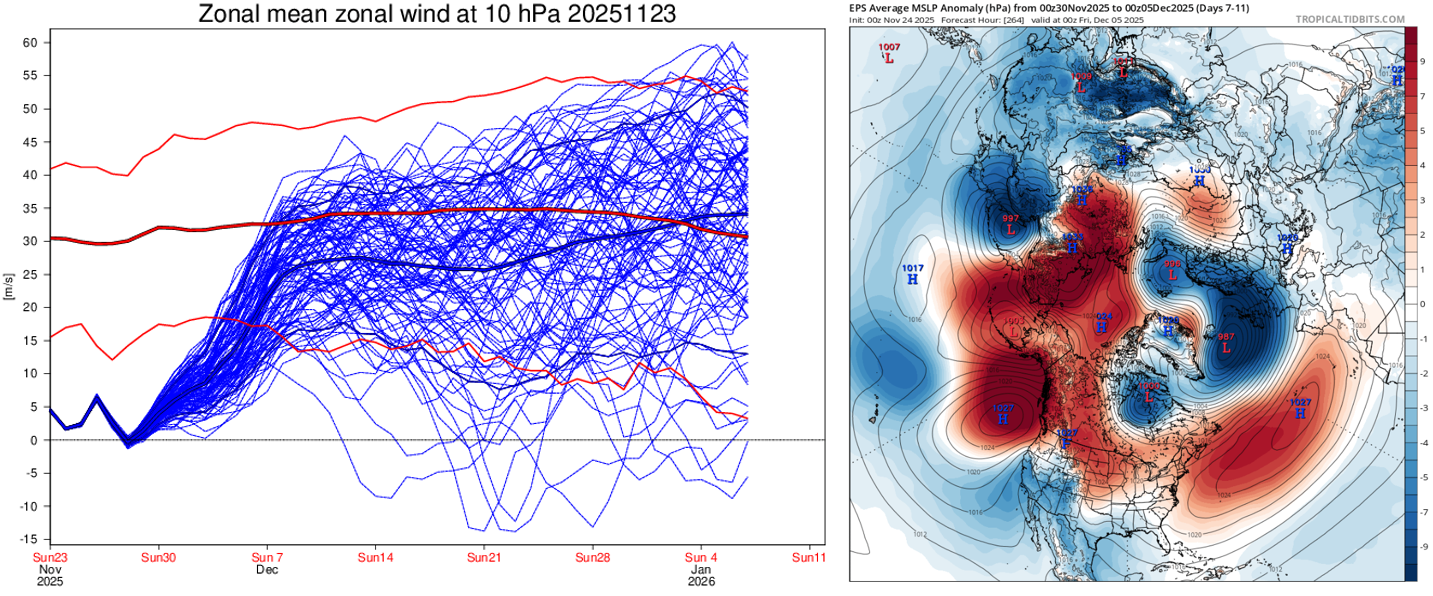 At the time of writing (24th November 2025), forecast guidance is in strong agreement that a reflective type sudden stratospheric warming event will occur at some point within 24th-28th November. This is evident in zonal mean zonal wind predictions by the European Centre for Medium Range Weather Forecasts’ extended ensemble model (see below-left). After being near or below zero through 28th November, this mean wind is predicted to increase rapidly until about a week into December.