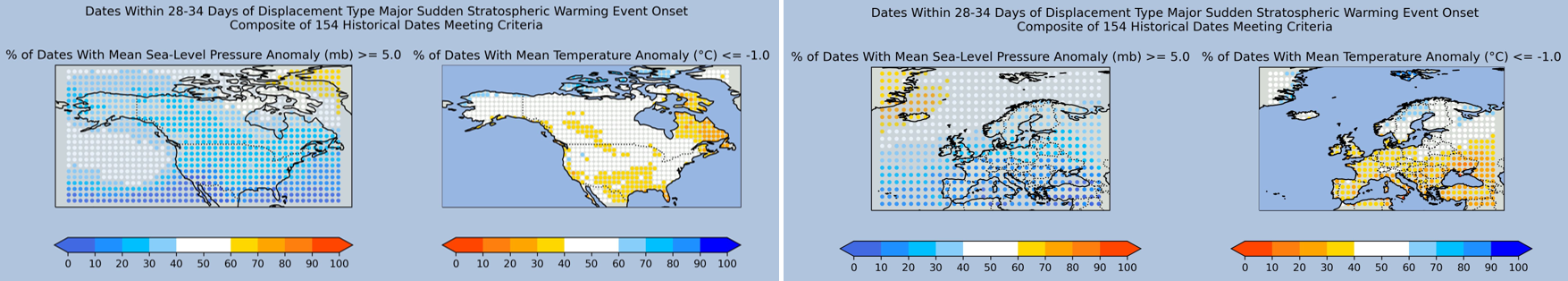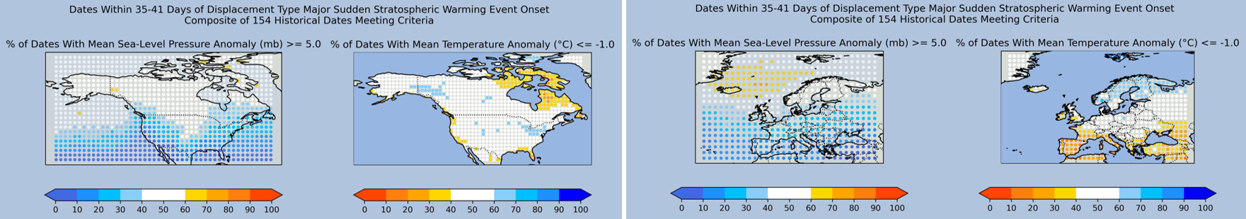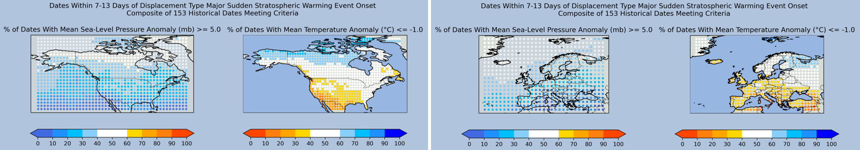 Since 1958, all but one of the displacement type major sudden stratospheric warming events has moved the polar vortex to sit above somewhere between the North Atlantic and northern Asia. Meanwhile, an anomalous anticyclone occurs above somewhere between the North Pacific and North America.