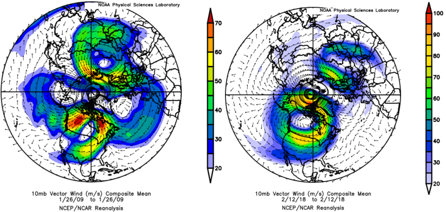 The January 2009 event featured ‘anti-vortexes’ (anticyclonic circulations) so powerful that their wind speeds can clearly be seen on the composite, as the pair of clockwise circulations. The child polar vortexes are situated over North America and northern Asia. The February 2018 event was similar, except for the vortex on the Eurasian side being closer to Europe.