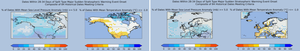 In Europe, the cold weather frequency generally reduces. Throughout these first 5 weeks, the high latitude blocking signal has yet to reach more than 50% anywhere within the two continental regions. Yet it’s well documented that such blocking usually features in the wake of major SSW events. From this we can infer that these probabilities are held down by variation in the location of the blocking high. Sometimes it’s nearer Europe, sometimes North America. Other times it moves between the two, and at a pace which varies between events.